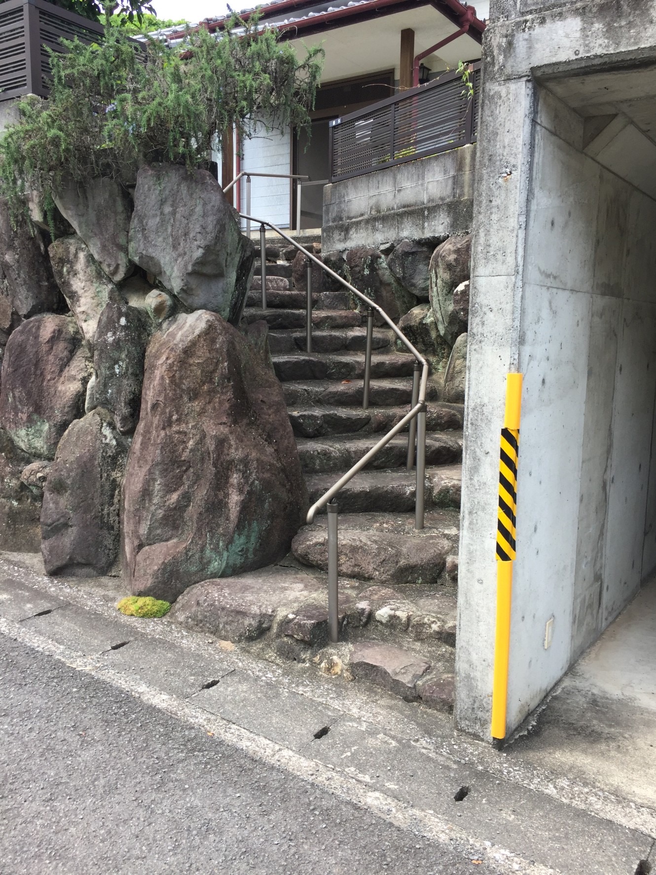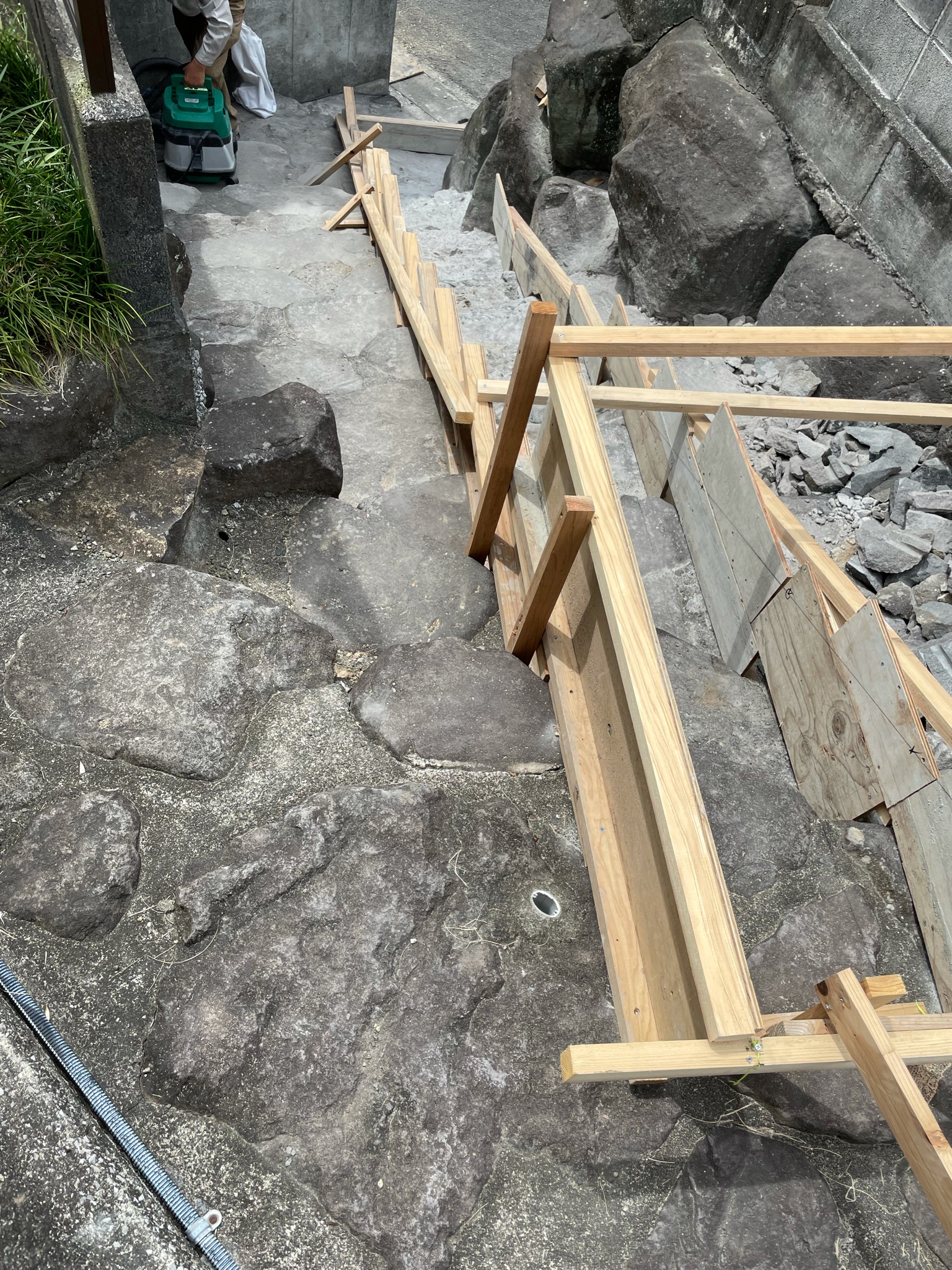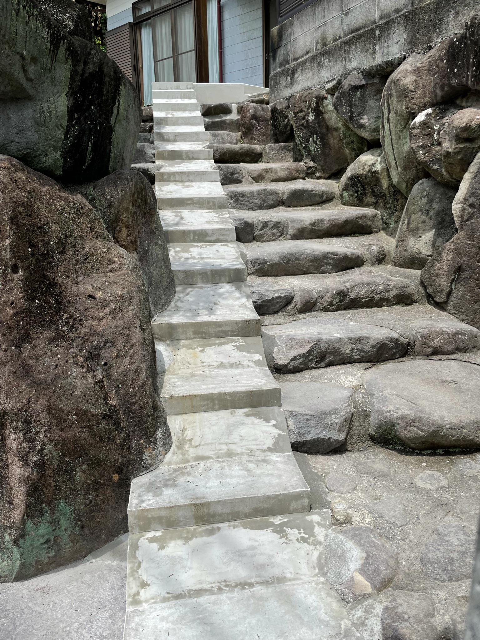 やる気になれば、知恵も沸くもので又、ご主人の息子さんの良いアドバイスもあり大きな機械を入れて大工事にするよりも手間でもキッチリ測量し、人海戦術で必要最低限の自然石階段の除去と必要限度のコンクリートの基礎工事を行う方針で何とか少額で完成することができました。 ご主人からも大変喜んで頂き大満足です。