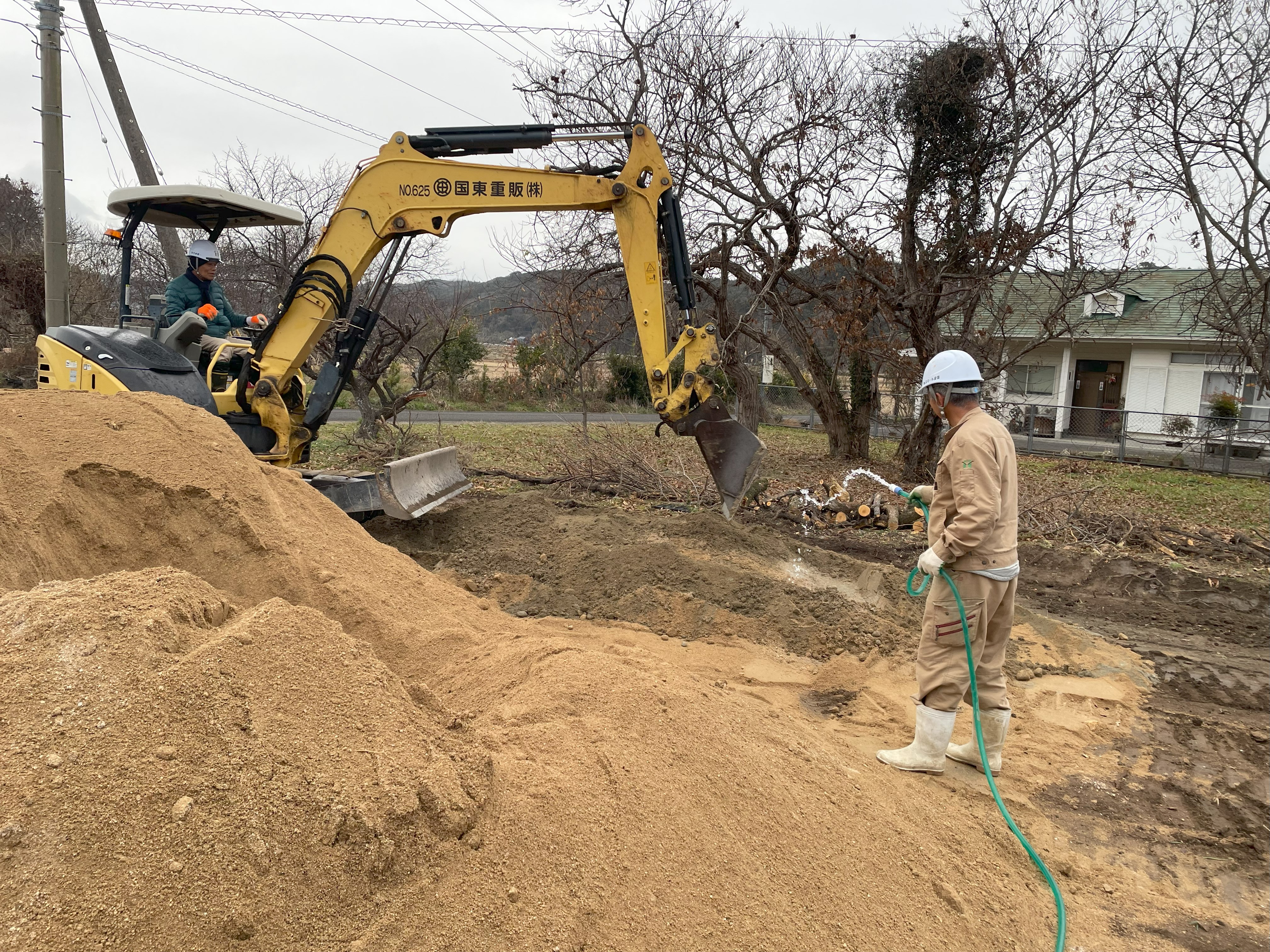 ②真砂土、セメント、水を混ぜる・・・撹拌機やセメントミキサーなどで混ぜる必要は無く、ユンボでかき混ぜる程度でも十分です。