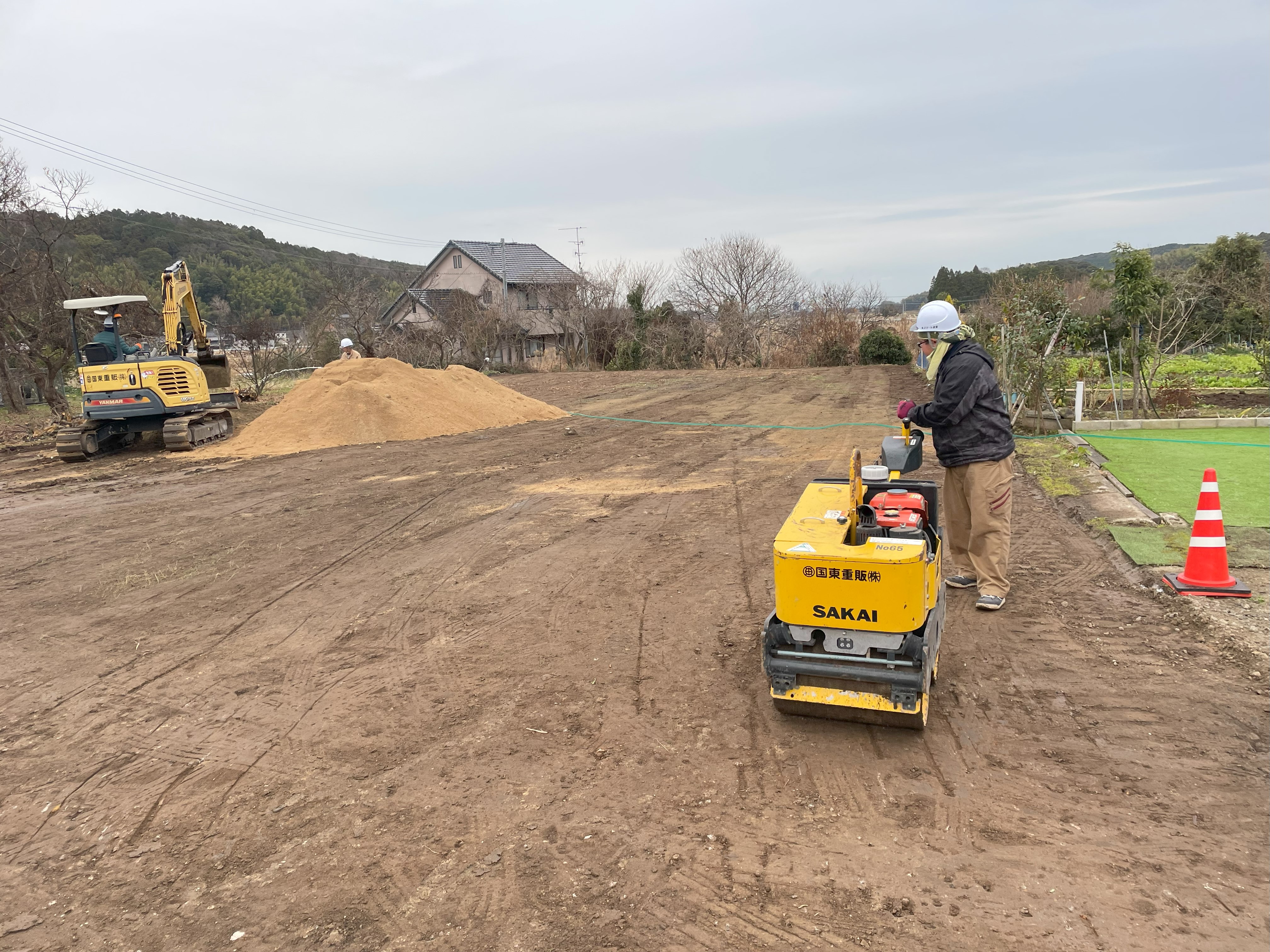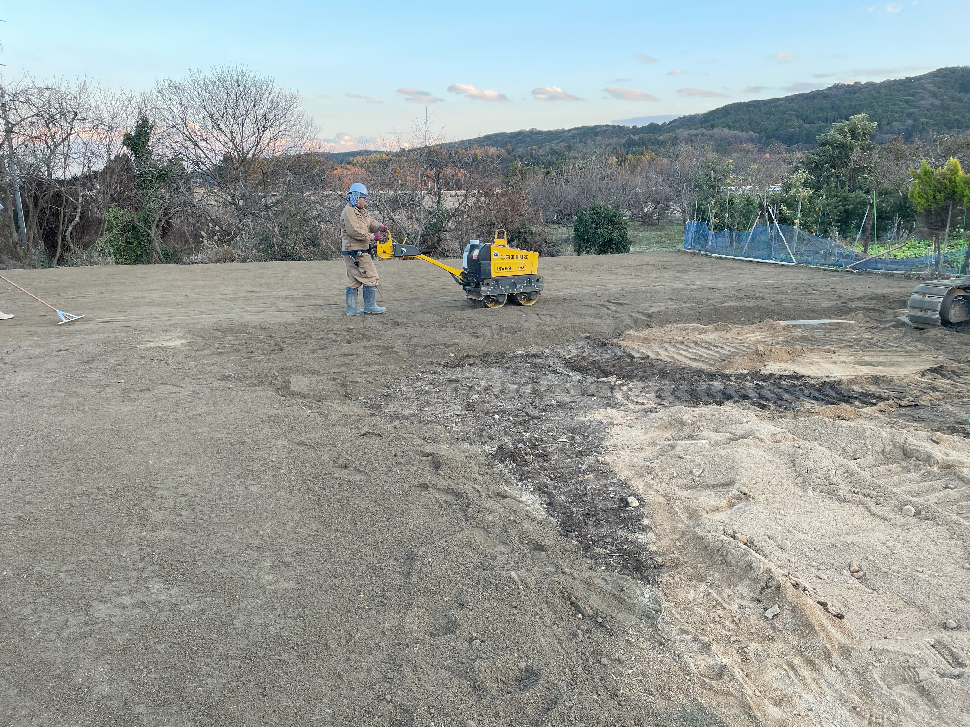 ④転圧・・・整地後、セメントが固まる前に転圧し、踏み固めていく