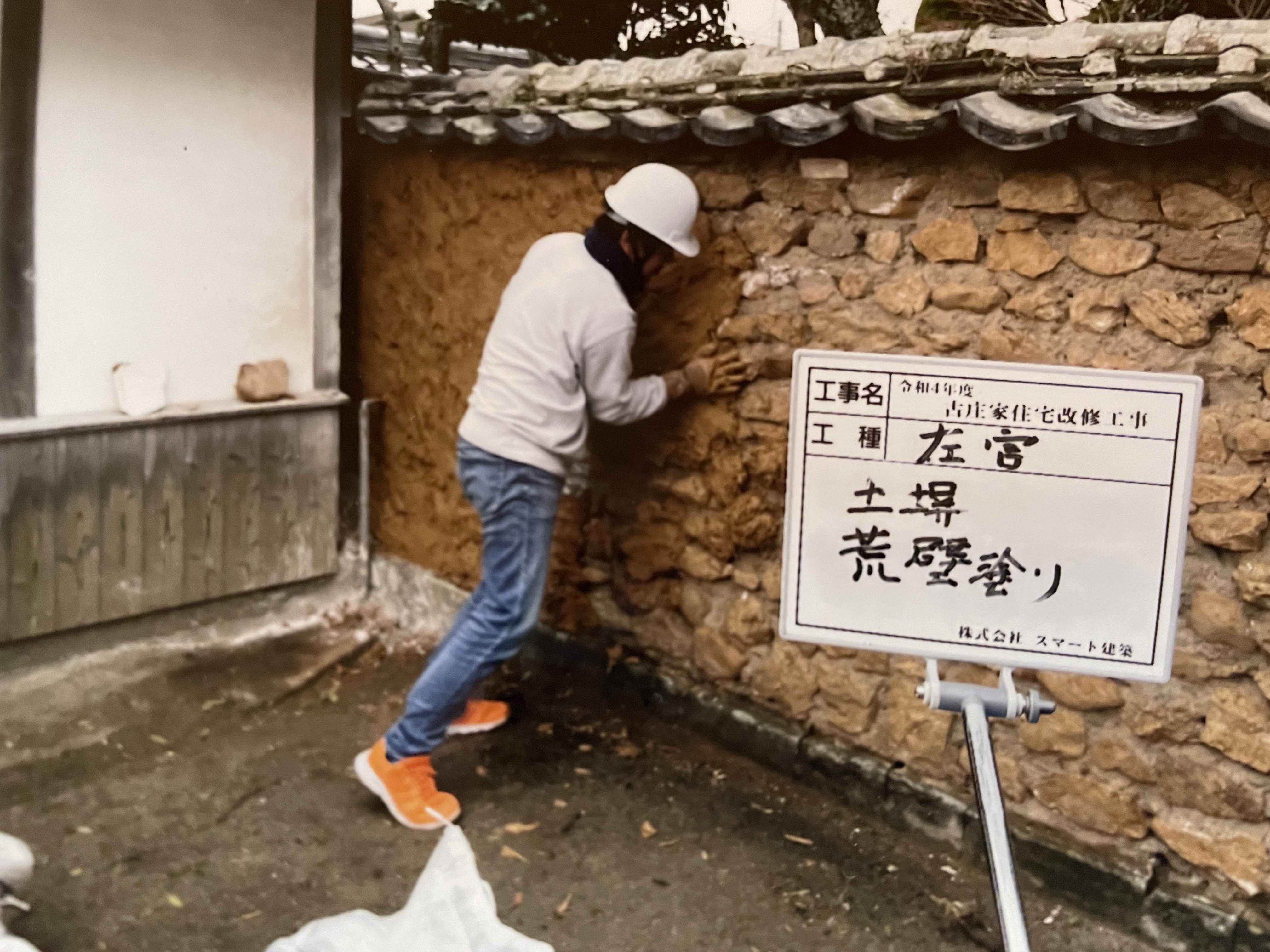 シックイの剥ぎ取り後、接着剤を塗布しいよいよ荒壁塗り(下塗り)をしてい行きます。